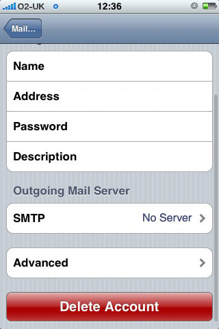 Back in the mail settings, select the account you have just configured. Scroll down to the Outgoing Mail Server and select SMTP (No server).